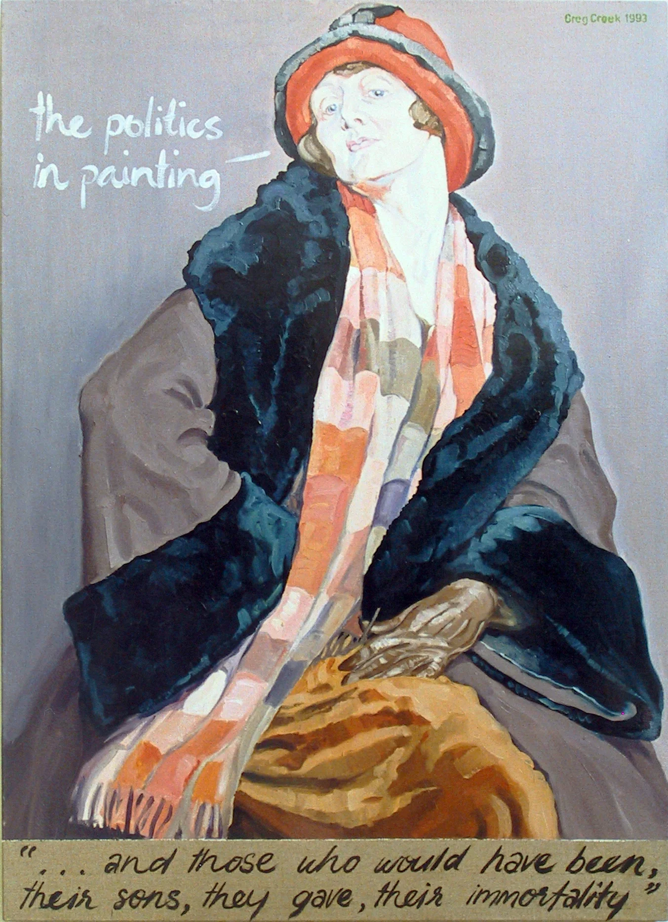 ART + TEXT... is a work of ten paintings which include texts in the form of speech bubbles, dialogue boxes and captions, satirising and reviewing some of the conventions and pretensions in local Australian art history. It comprises 8 copies after Australian tonal realist/academic paintings, dating from 1883 (Lucy Walker) to 1958 (Sir William Dargie) plus two original paintings all which involve texts in the form of speech bubbles, dialogue boxes and captions.
