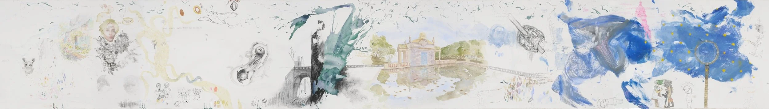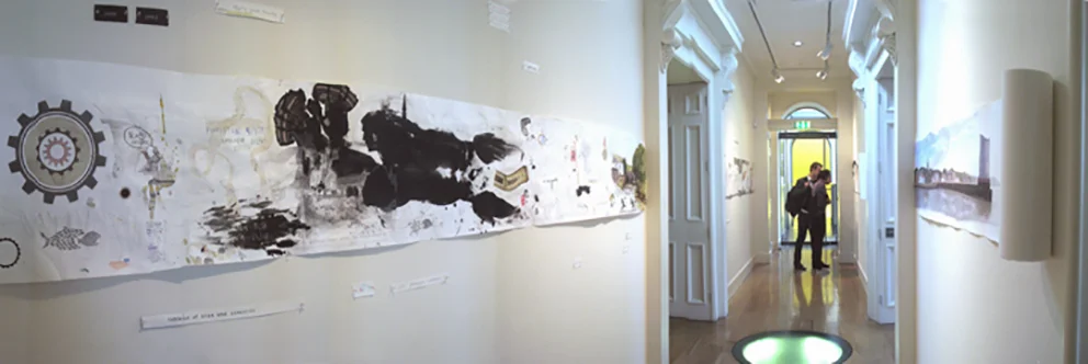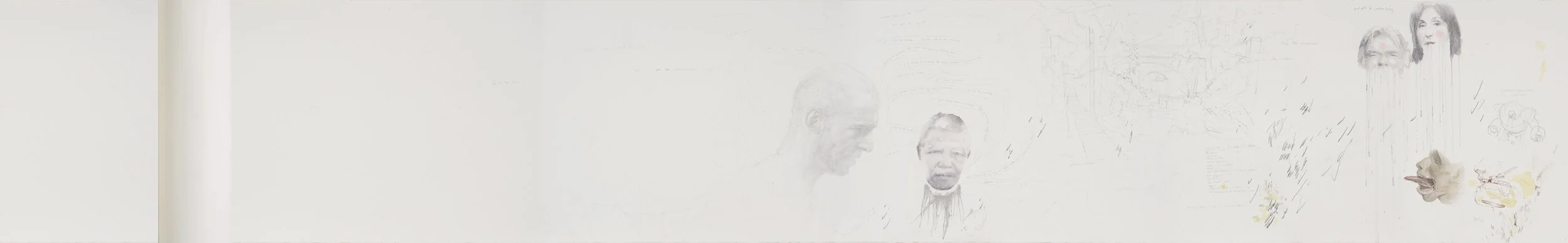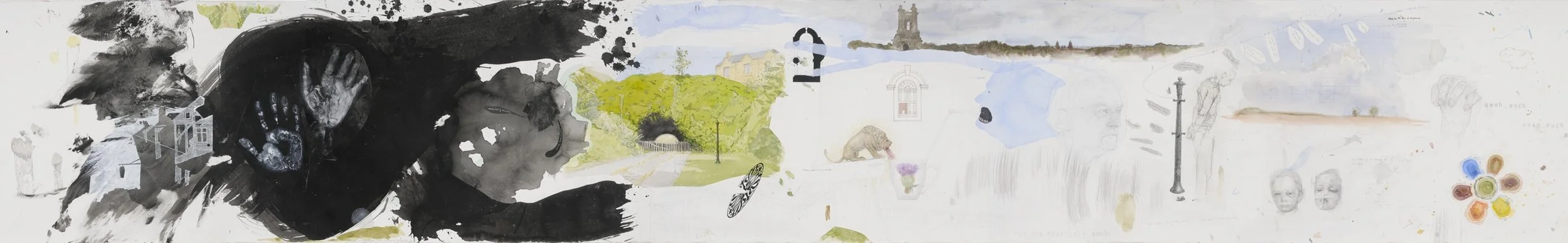 The work is a panorama of Edinburgh and in this installation creates a horizon line around the gallery walls. However, as well as evoking landscape traditions it is also a portrait of a city, and as such represents Creek’s experience of Edinburgh - his research, encounters and responses to place, its history and people.