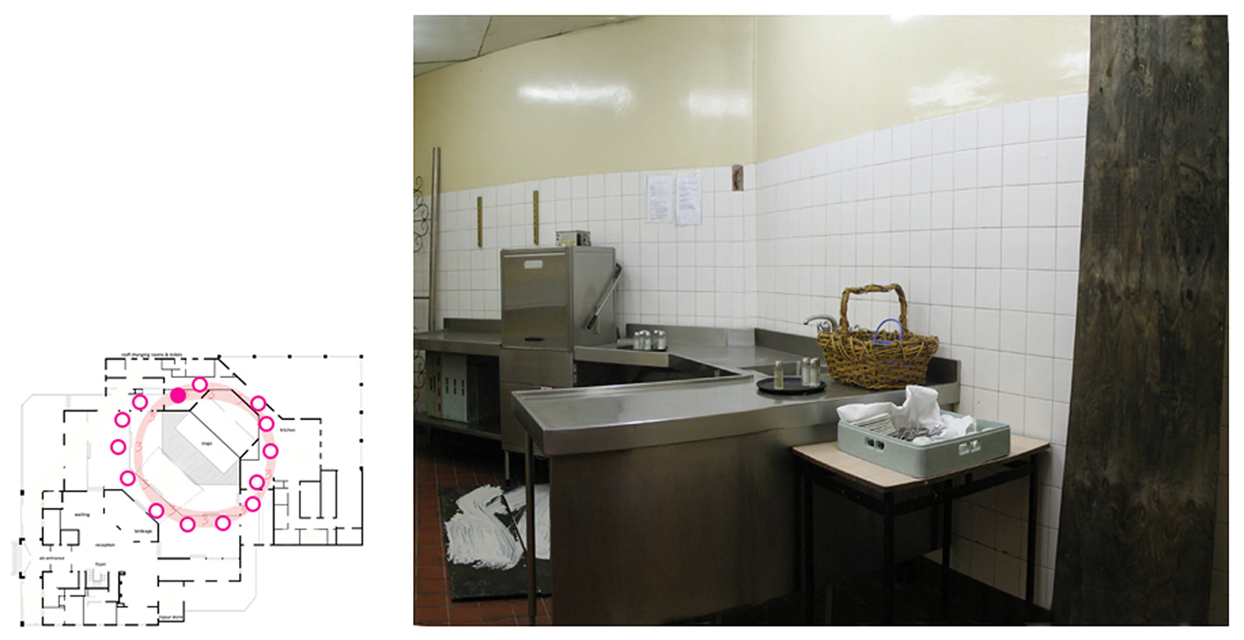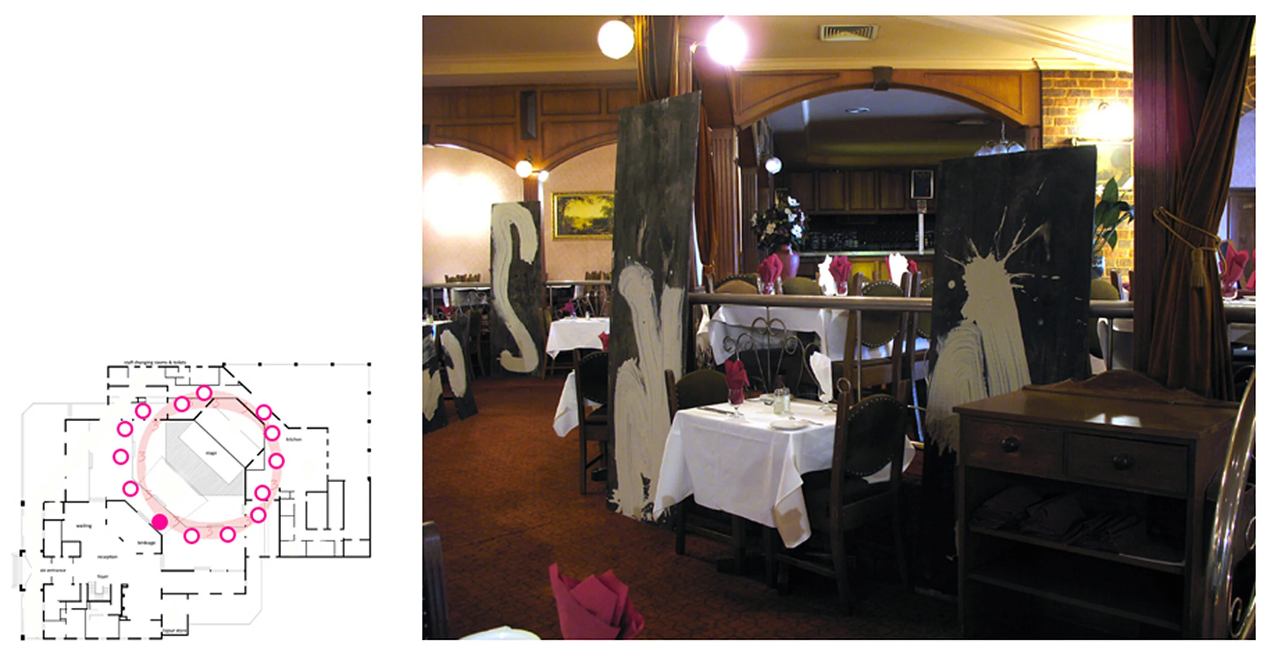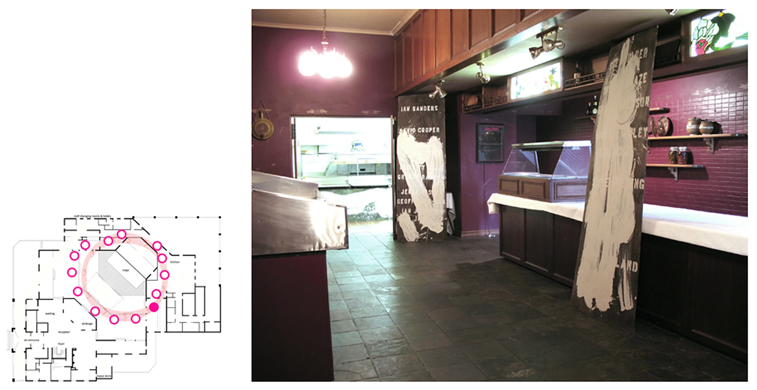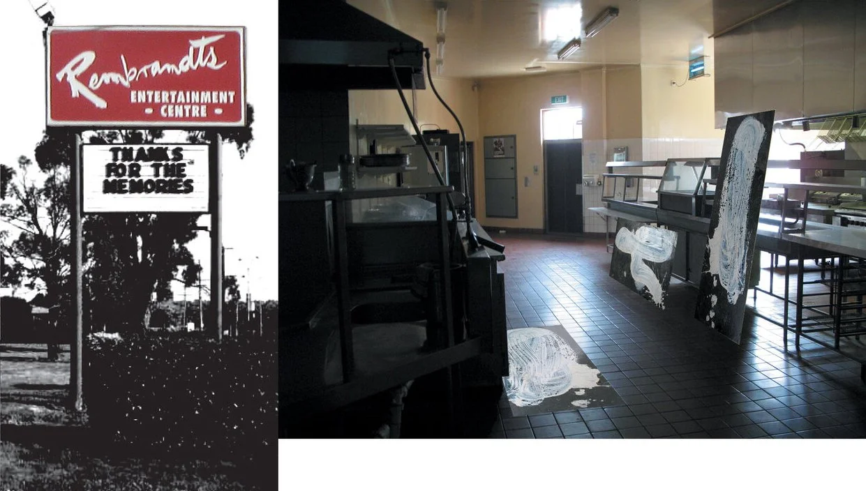 This work marks a trail through an abandoned Function Centre in an outer suburb of Melbourne, Australia. Cladding boards carry the amending sweep of a mopped gesture of liquid clay slip that obscures details of the boards and image or texts, some of which are the stenciled lists of local city councilors. The boards are positioned against parts of the built interior – obscuring a number of kitsch reproductions of Dutch painter Rembrandt van Rijn’s paintings or leaning against columns, grouping around areas of floor, marking passages and so on. The boards follow a path that circles from the kitchen areas, through the adjacent servery areas and around the front-of-house dining areas. The work traces a mopping/cleaning motif from the service areas of Rembrandt’s through its public areas, relating both aspects. The cleaning, wiping-away gesture embedded in the clay and hoarding boards suggests a wiping out of memory, site and form yet one that is overlaid with ambivalent notions of agency or affirmation - the identity KNOX CITY and the names of individuals, perhaps locals in whose name Rembrandt’s does or does not exist.