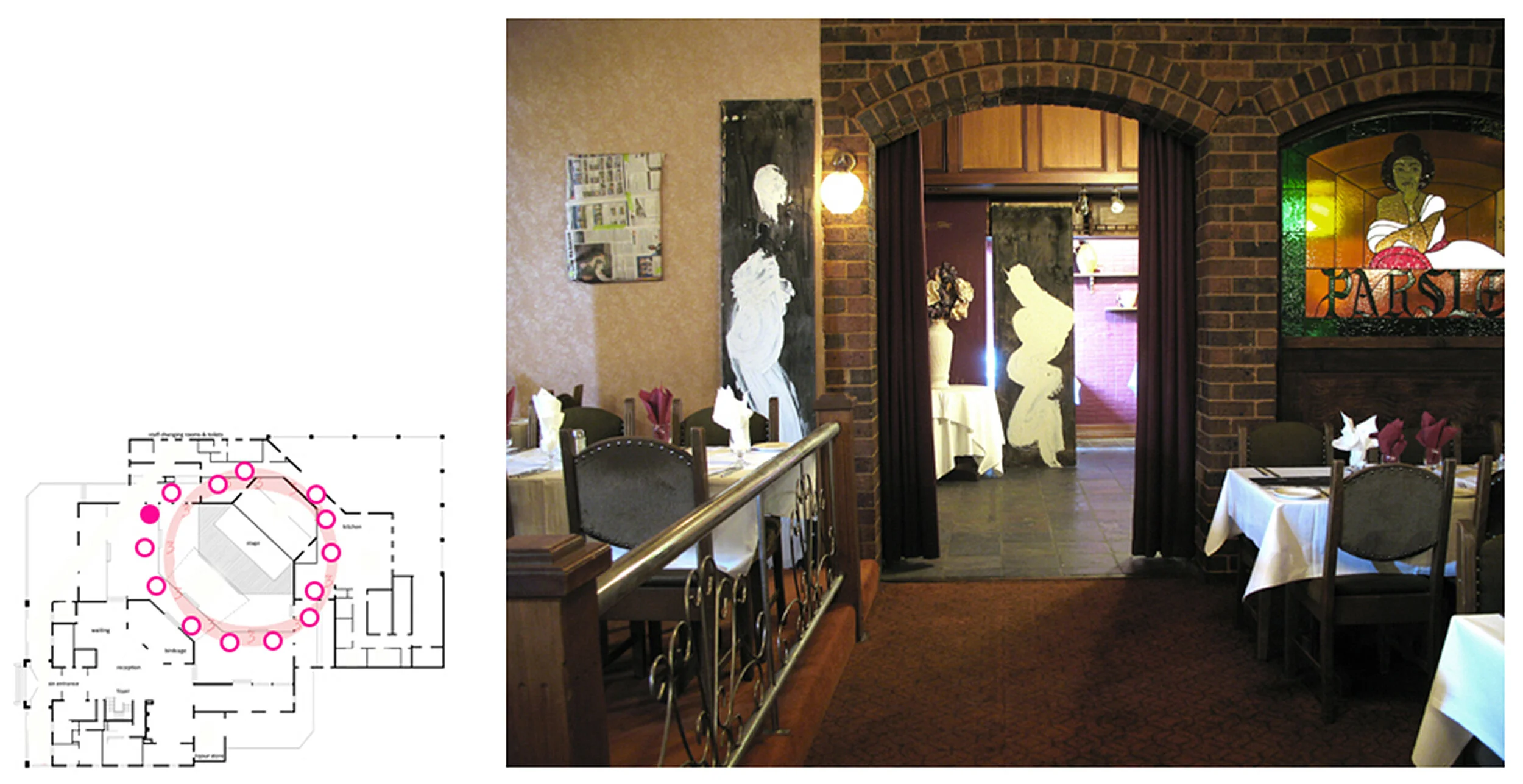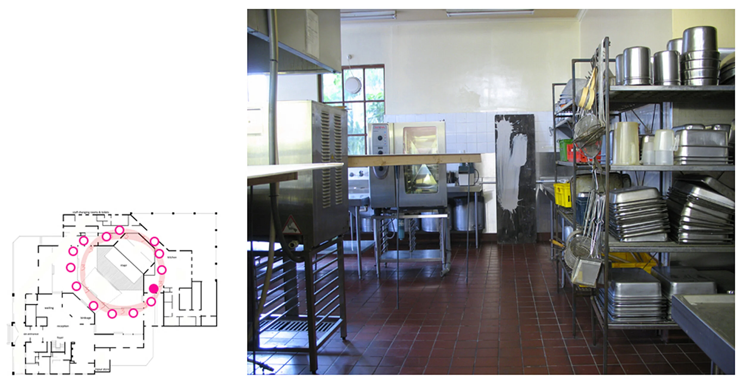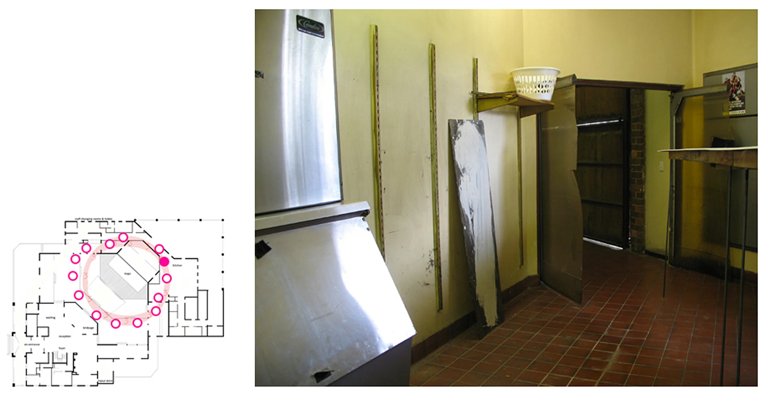 This work marks a trail through an abandoned Function Centre in an outer suburb of Melbourne, Australia. Cladding boards carry the amending sweep of a mopped gesture of liquid clay slip that obscures details of the boards and image or texts, some of which are the stenciled lists of local city councilors. The boards are positioned against parts of the built interior – obscuring a number of kitsch reproductions of Dutch painter Rembrandt van Rijn’s paintings or leaning against columns, grouping around areas of floor, marking passages and so on. The boards follow a path that circles from the kitchen areas, through the adjacent servery areas and around the front-of-house dining areas. The work traces a mopping/cleaning motif from the service areas of Rembrandt’s through its public areas, relating both aspects. The cleaning, wiping-away gesture embedded in the clay and hoarding boards suggests a wiping out of memory, site and form yet one that is overlaid with ambivalent notions of agency or affirmation - the identity KNOX CITY and the names of individuals, perhaps locals in whose name Rembrandt’s does or does not exist.