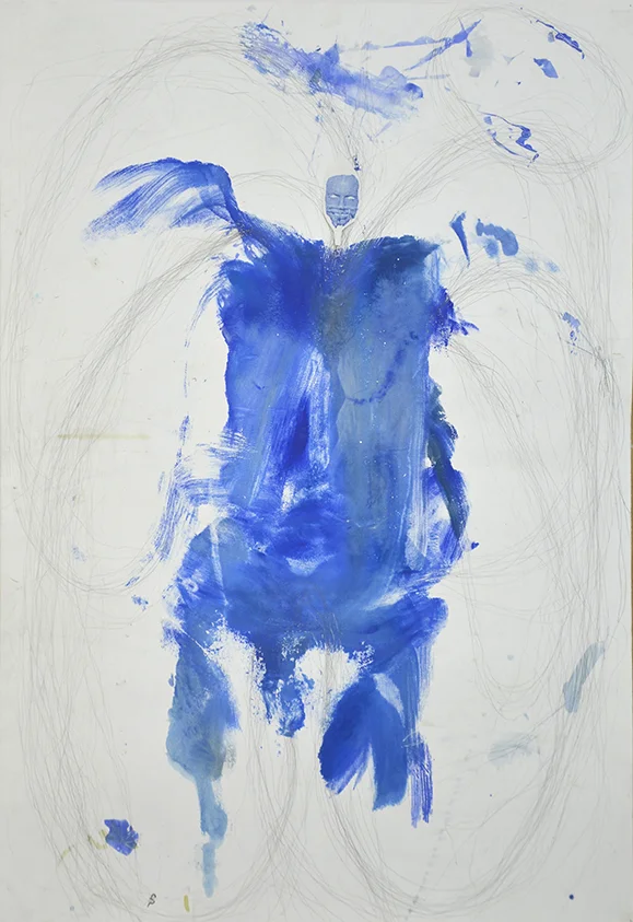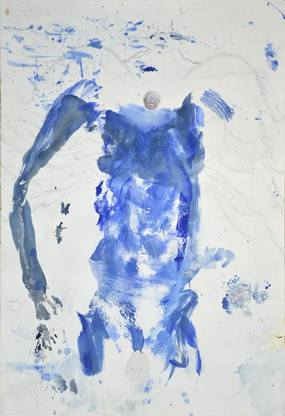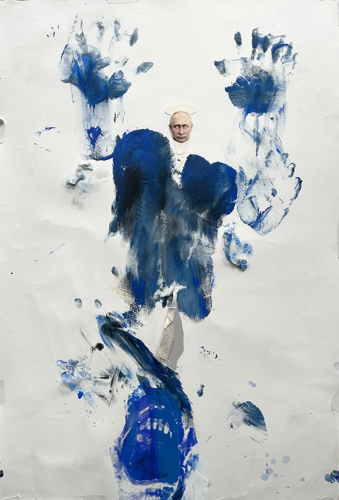 The inked self makes physical body prints on paper, which form a ground or landscape from which the drawing emerges. There is a playful use of scale in the attachment of small ink-jet transfer prints of 20th century and historical international political leaders, related to the various ‘continents’ of the world.