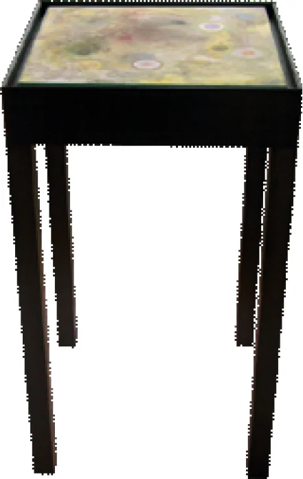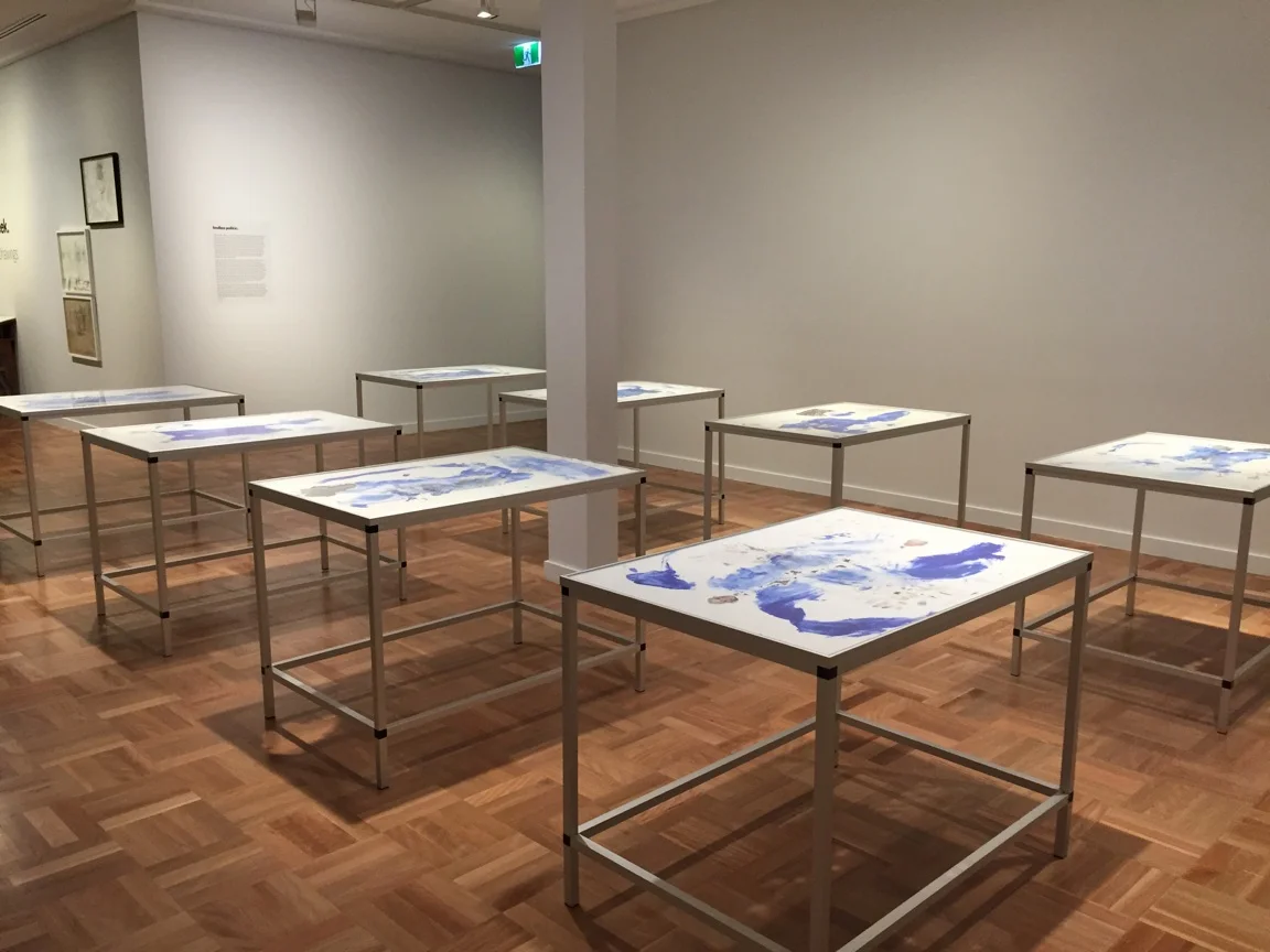 Body print, mixed media on cut, sewn paper, aluminium frame, acrylic sheet, 8 tables, 108 x 77 x 80cm each (installation view Shepparton Art Museum, Australia, 2015)