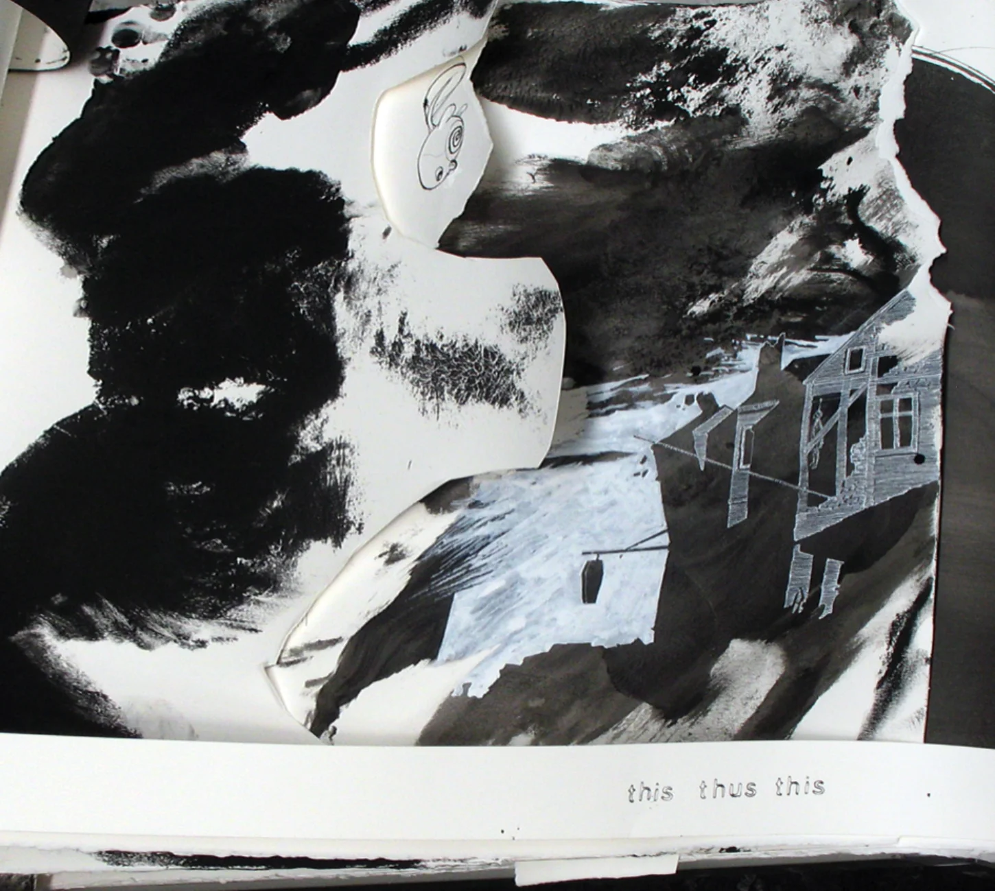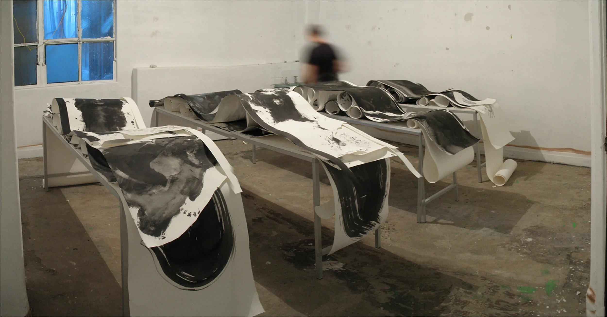 The table top workspaces gather together assemblages of materials comprising body prints, mopped paper rolls, drawings, other excess and unused paper; and print transfers of images. Each table comprises six or seven strata of paper. Stacking of paper into three-dimensions opens up cavities, volumes and elisions while unfixed piles of paper produce massing but also collapses, falls and overflows. The composite form produces an instability of boundaries of the figure.