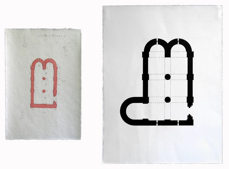 Representatives installs in a gallery space ‘left’ and ‘right’ wings of composite drawings of annotated sketches and finished drawings of ‘romanesque’ church plans. These become metaphors and caricatures of parliaments.